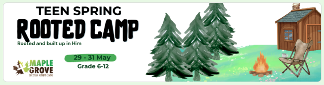 Maple Grove is located near London (about 2 hour drive). We’d be looking at leaving Dunnville at around 4:00pm on Friday the 29th. Transportation will be provided with volunteer vehicles. At Maple Grove, we have access to two cabins - one for the guys and one for the girls, so we can stay together. There will be great games, food, worship and fun as we explore the theme from Scripture.
